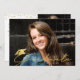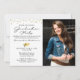 Convite de festa de formatura moderno com 2 fotos (uma de cada lado) com um título de FORMANDO de tipografia de script chic, moderno e manuscrito, acentuado com um boné de formatura ou placa-mãe em ouro como uma sobreposição em uma foto de sangria de cheio na frente. Os detalhes do seu convite de festas estão atrás. ASSISTÊNCIA: para obter ajuda com a modificação ou personalização do design, alteração de cor, transferência do design para outro produto ou você gostaria de coordenar itens, entre em contato com o designer ANTES DE ENCOMENDAR através da guia MENSAGEM de bate-papo Zazzle ou envie um email para makeitaboutyoustore@gmail.com.