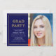 Convide amigos e família para a sua festa de formatura com esta festa de formatura de fotos moderna chic, com as palavras "Partido Formando" em uma letra de linha geométrica na moda e uma borda em folha de ouro falsa contra um fundo azul vibrante. A placa tem um padrão de tiras de folha de ouro falso contra um lado de fundo azul vibrante. Personalize-o substituindo o texto do marcador de posição e substitua a foto do marcador de amostra/marcador de posição por sua própria foto. Para obter mais opções, como alterar a fonte e seu tamanho/cor ou o espaçamento entre letras, clique no botão "Personalizar". *Observe que a Marca d'água Zazzle que aparece na visualização de zoom NÃO aparecerá no produto impresso final © Rosewood e Citrus