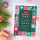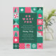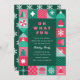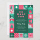 Um convite de festas de Natal ousado, brilhante e colorido, com formas geométricas de árvores de Natal, estrelas, flocos de neve, ornamentos, mitenes, chapéu de Santa, etc. Este convite para festas de feriado é feito em cores não tradicionais, cor rosa, azul claro e tons de verde. Todo o texto é editável. No verso está um padrão repetitivo de floco de neve. Este convite é perfeito para festas de férias empresariais e festas de feriados pessoais.