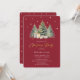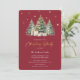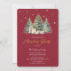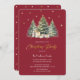 Nossa design apresenta uma elegante e moderna pintura aquosa de três árvores de Natal com presentes embaixo, sobre um fundo vermelho com estrelas douradas falsas e flocos de neve.