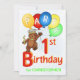 Um convite de festas do primeiro aniversario do divertimento com o nome da sua criança que caracteriza um príncipe de um urso de ursinho toda decked para fora em uma coroa jeweled colorida que guardara um grupo do balão colorido com letras nelas que o período para fora PARTY. Personalizar com nome da sua criança fá-lo extremamente especial. Toda a informação do partido pode ser personalizada usando o modelo fornecido. Nós especializamo-nos no design feito-à-medida, assim que contacte-nos se você gostaria de uma disposição feito sob medida original usando este design real básico do urso de ursinho para a celebração memorável do aniversário do seu miúdo.