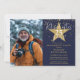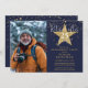Este elegante convite de festas de aposentadoria azul com estrelas douradas pode ser personalizado com todas as suas informações especiais de celebração e fotos. Projetado por Thisnotme©