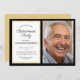 Este convite de festas de retirada de fotos oferece um layout elegante e profissional, com uma borda preta que é acentuada por uma borda dourada mais fina. Foto personalizada e texto que permite adicionar uma imagem do honroso e dos detalhes do seu grupo de aposentadoria.