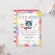Placa modelo de convite de aniversário, branca e colorida, com pinturas coloridas arco-íris, com brilhos dourados falsos à volta da placa, com um texto colorido que diz "PINTA de VAMOS". Há também um bonito buldogue francês com chapéu vermelho de berete e cachecol, paleta de pintura e pincel de pintura. A mensagem no topo diz "Vamos colocar a ART no pARTy." Perfeito para pintura, artesanato, festa de arte para crianças.