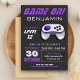 Este convite para o aniversário de criança moderno apresenta um controlador de jogos roxo e branco e uma tipografia moderna. Basta adicionar os detalhes do seu evento neste modelo fácil de usar para torná-lo um convite de tipo único. Sacudir a placa para revelar um padrão de listras roxa e cinza na parte traseira da placa.