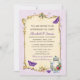 Convites de festas de chá em francês roxo, Vintage, apresentam um pote de chá e borboletas com um quadro francês romântico e fundo cor damasco.
