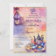 Festa de chá turca árabe, festa islâmica mehndi henna convite para descarregamento instantâneo, copos de chá turcos modernos de cor d'água potes lanterna marroquina com Bismillah para comemoração do casamento anterior a mehndi.