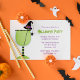 Convites personalizáveis para o Festa de Halloween que incluem um fantasma de desenho animado e uma bebida verde assustadora com um dentro de aranha. Arte por Designs de JW.
