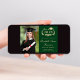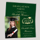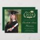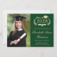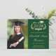 Anúncio clássico do formandos verde e convite de festas com uma coroa de louros, um boné de formando e um diploma, uma foto do formando e seu nome em um guião elegante de ouro claro. Adicione seu ano de aula, escola, major, honras, planos futuros, etc., em tipografia de ouro leve. No verso, adicione os detalhes da parte.