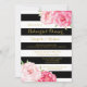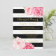 Convites de festas de janto de ensaio personalizados no padrão de listras preto e branco com flores de aquarela vintage e texto dourado.
