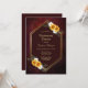 Um rústico e burguês janto de aposentadoria floral convite de festas com girassóis e rosas de algodão enquanto apresenta o texto dentro de um quadro geométrico dourado com um rico fundo burgundy.