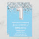 Convite de aniversário azul claro e primeiro aniversario prateado de idade 1 convite de festas com brilho e moderno roteiro escrevendo e balões de folha divertida.