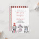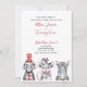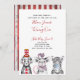 Seu bebê está virando um! Convide seus convidados especiais com este adorável convite que inclui animais de circo desenhados à mão em preto e branco. O nome do bebê, "Turning One" e a data estão em tipografia de script com letras vermelhas, e personalizados em um sans negro moderno chic. A parte de trás da placa apresenta uma textura do tema do circo vermelho e branco, giro e listrado. Copyright Elegant Invites, todos os direitos reservados.