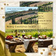 Um convite de festas de provando de vinho ao ar livre, de estilo italiano, que apresenta uma paisagem tucana com vinho tinto e aperitivos numa mesa de piquenique. A banda dourada na frente é opcional. Bonita festa de inauguração, aniversário, reunião familiar ou outra ocasião festiva.