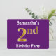 Este design de convite apresenta o número ordinal "segundo" com uma aparência falsa em forma de ouro. Ele também apresenta um nome personalizado e um fundo de cor roxa. Os detalhes do evento no verso podem ser personalizados. Poderia ser usado para convidar pessoas para a segunda festa de aniversário de alguém. [~Z0000014]