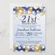 Um Convite de festas na moda. Design apresenta balões azuis e dourados marinhos, estrelas Douradas da brilha e texto azul marinho, tudo sobre um fundo azul claro de gradiente. Um design adorável convidando seus convidados a se juntar a vocês para uma festa de aniversário de 21 anos. Fácil de personalizar com os detalhes do seu próprio partido.