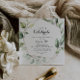 Este convite de festas geométrico elegante de celebração de vamos verde de ouro é perfeito para uma simples festa de noivado, festa de solteira, aposentadoria, graduação, casamento após festa ou qualquer evento ou festa. O design apresenta folhas de eucalipto verde botânico pintadas manualmente, enfeitando uma armação geométrica dourada.