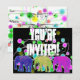 Os elefantes neon andam na fila com um fundo cósmico brilhante e linhas onduladas atrás para quem, onde e quando da sua festa!