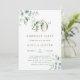Este convite de festas apresenta cor d'água pintada de eucalipto e folhas verdes com números botânicos de ouro.