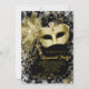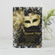 Convite de festas preto e mascarada de ouro com uma bela máscara de joia dourada sobre um fundo elegante de bokeh e design de ouro brilhante no verso. Este belo convite de festas mascarada preto e dourado é facilmente personalizado para o seu evento simplesmente adicionando os seus detalhes no estilo de letra, cor e redação da sua escolha.