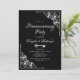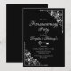 Um elegante convite de festas preto-e-branco para a agricultura doméstica, com cantos diagonais de rendas de ornamentado para enquadrar o texto branco.