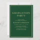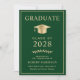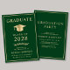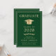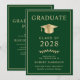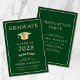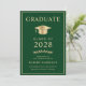 Anúncio e convite de festas elegantes do formandos verde, apresentando um boné de formatura de ouro e uma tipografia de ouro moderna para o nome do formando, ano de aula, universidade ou universidade, grau e grande ou honras. No verso, adicione os detalhes da graduação.