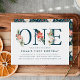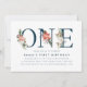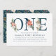 Na moda, convites elegantes de primeiro aniversário que incluem letras de marinho com poinsettias de cor vermelha, rosas de marfim, bagas ocas e acentos de folhagem verde. Personalize os convites de festas de primeiro aniversario com tema de férias/inverno adicionando seus detalhes de festas. O verso dos convites apresenta um padrão floral de aquarela de inverno em relação a um fundo de marinho.