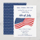 minimalista em 4 de julho de convite de festas. Apresentando a icônica bandeira dos EUA no centro, este convite ostenta um design elegante em vermelho clássico, branco e azul. O verso do convite apresenta um encantador padrão de estrelas brancas sobre fundo azul, acrescentando um toque festivo ao seu convite. Perfeito por convidar amigos e família para se juntarem a vocês para comemorar este feriado patriótico, estes convites darão o tom para um memorável encontro de 4 de julho.