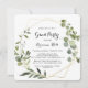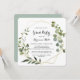 Esse convite de festas geométrico de formando de caligrafia tropical em ouro é perfeito para uma simples celebração. A design apresenta lindas folhas verdes pintadas à mão, enfeitando um quadro geométrico dourado.
