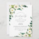Este elegante convite de festas floral branco é perfeito para uma festa clássica ao ar livre. A design da colheita moderna apresenta marfim lindamente romântico e rosa de cor-de-água creme e flores de pénia com folhas verdes escuras, verde-verde e botânica.