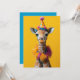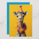 Uma girafa de bebê encantadora vestida para comemorar, vestindo um chapéu festivo com padrões coloridos e decorações fofinhas. A girafa estiva uma jiboia de penas multicolorida e fluída, e se posiciona contra um fundo amarelo brilhante, criando uma cena alegre e caprichosa.