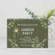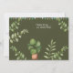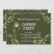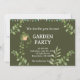 Um convite com letras brancas em fundo verde e com muitas plantas verdes e linhas de bandeira. Destinado a uma festa de jardim no verão. Totalmente personalizável de ambos os lados.