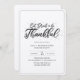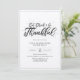 Um simples design com foco no cabeçalho de tipografia de caligrafia branca que diz "Coma, beba e seja grato" sobre um fundo de papel kraft, inclui um modelo no verso para uma mensagem extra para amigos e familiares.