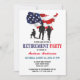 Convite moderno para aposentadoria de bandeiras dos EUA. O Design apresenta a bandeira dos EUA e os detalhes da parte na frente e a bandeira dos EUA. Perfeito para festa de aposentadoria. Modelo pode ser modificado.