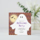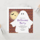 O Ghost Halloween Party convida com um padrão moderno de cromo laranja, roxo e preto junto com lua e morcegos.