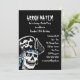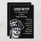 Este convite de aniversário pirata apresenta um crânio vestindo um aro de ouro, um bandana azul e um chapéu de pirata preto com crânio e bósforos sobre fundo preto com texto branco personalizável. Pode ser usado como convite de festas, cartões de agradecimentos, anúncio e muito mais.