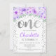 Primeira Convite de aniversário. Design elegante em prata brilhante com verde e sotaque floral. Convide cartão com brilho "Um" na fonte do script com confetti. Púrpura, branca e verde-menta. Perfeito para uma festa de na moda 1rua.