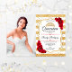 Quinceanera convite de festas com sua foto. Apresenta faixas, fontes de script, rosa vermelha, tiara e confetti. Design vermelho branco clássico com ouro brilhante. Perfeito para uma celebração elegante.