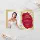 Quinceanera convite de festas com sua foto. Apresenta fontes de script, rosas brancas, tiara e confetti. Design vermelho clássico com ouro brilhante falso. Perfeito para uma celebração elegante.