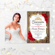 Quinceanera convite de festas com sua foto. Apresenta padrão de madeira rústico, fonte de script, rosas vermelhas, tiara e confetti. Design vermelho preto clássico com ouro brilhante. Perfeito para uma celebração elegante.