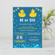 Convide seus hóspedes com este convite de festas bonito revelador com patos de borracha adoráveis com tipografia moderna contra um fundo azul. Basta adicionar os detalhes do seu evento neste modelo fácil de usar para torná-lo um convite de tipo único. Sacudir a placa para revelar um padrão de listras amarelas e brancas na parte traseira da placa.