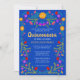 Convite Real Blue Quinceañera para a comemoração de Aniversário do 15 da sua filha. Este tema da Quinceañera mexicana apresenta flores brilhantes e coloridas de arte folclórica mexicana em vermelho, rosa, roxo e amarelo em um fundo azul real. A parte de trás do cartão tem papel picado floral e mais flores. O modelo está pronto para você personalizar o cartão com todos os seus detalhes pessoais para a sua doce festa 15. Procure na nossa loja itens correspondentes e coordenadores.
