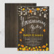 Concurso Rustic Housewarming com padrão de madeira castanho escuro e luzes de fadas de cordas. Apresenta Mason Jars e outono. Perfeito para uma festa de estilo rústico. Envie-me uma mensagem se precisar de mais personalização.