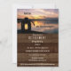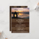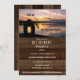 Convite de festas de aposentadoria com uma lanterna ao lado do lago no pôr do sol e madeira escura rústica.