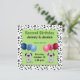 Convite de festas de gêmeos fraternais, de menino e menina, com tema verde, rosa, azul e dalmático.