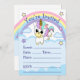 O Partido Unicórnio convida para qualquer ocasião. Um unicórnio bebê bonito saltando sobre nuvens azuis em frente a um arco-íris, nuvens e estrelas de cor pastel. Use o convite como está ou substitua o texto em qualquer modelo.