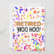 Aposentado! Woo Hoo! Engraçado dizer cartão de convite. Design original. Vazio para mensagens escritas à mão.