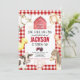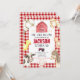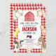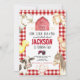 Um belo convite de aniversário de fazenda com gingham vermelho. As lindas cores rústicas do pastel ajustado qualquer estilo de festas como Ranch, Farmhouse, Petting Zoo ou Farm Animal Party.