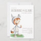 O convite para crianças à Páscoa e à caça ao ovo, bonitinho e moderno, com uma ilustração de uma criança numa fantasia de coelho e na sua cesta de Páscoa. Ilustrada e projetada por Patricia Alvarez.