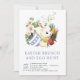 Convite moderno de Páscoa de cor aquosa e caça a ovos, com a apresentação de Coelhinho da Páscoa num acordo de floral de primavera de cor aquática, uma galinha e ovos.